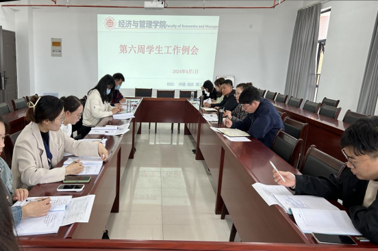 2024年4月1日中午,william威廉中文官网在行政楼725办公室召开本学期第六周员工管理工作例会,副经理秦品德、书记助理叶赵强、经理助理张珊以及全体辅导员参加会议,会议由吴玲经理主持。