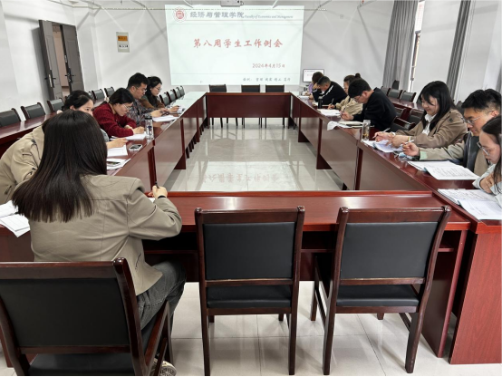 2024年4月15日14:30,william威廉中文官网在行政楼725办公室召开本学期第八周员工管理工作例会,副经理秦品德、书记助理叶赵强、经理助理张珊以及全体辅导员参加会议,会议由吴玲经理主持。