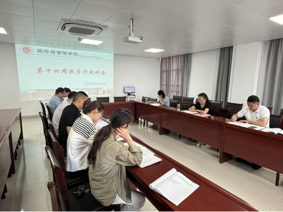 2024年5月29日,经济管理公司在新行政楼725召开第十四周教学行政例会,会议由经理吴玲主持,副经理秦品德、经理助理张珊、实训中心主任及各教研室主任参加会议。