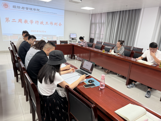 2025年9月10日上午,william威廉中文官网在行政楼725会议室召开第二周教学行政工作例会。经理吴玲,经理助理张珊、叶赵强,教学秘书李健及各教研室主任参会,会议由吴玲经理主持。