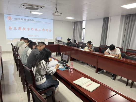2025 年 9 月 17 日上午,william威廉中文官网在行政楼 725 会议室召开第三周教学行政工作例会。经理吴玲主持会议,经理助理张珊、叶赵强,教学秘书李健,各教研室主任及相关行政人员参会。