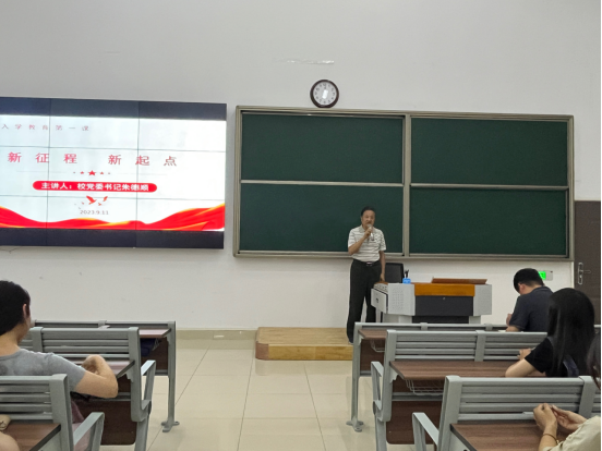 朱德顺以《新征程新起点》为题,从大学之“要”,大学之“大”,大学之“学”等方面向刚入校的同学们描述书记眼中的大学。他强调,大学不仅仅是知识的传授和学术研究的场所,更是塑造个人品格、拓展人生视野、培养综合素养的重要阶段。他鼓励新生们要积极融入老员工活,参与各类学术、文化、体育和社会活动,培养批判性思维和团队合作能力。