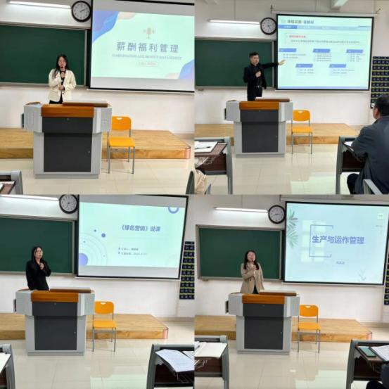 在说课环节,教师李莜莜、吴臻、魏圆圆、周真真四位教师分别从“教材、学情、课程目标、教法学法、教学过程设计、课程考核”等方面进行了说课展示。