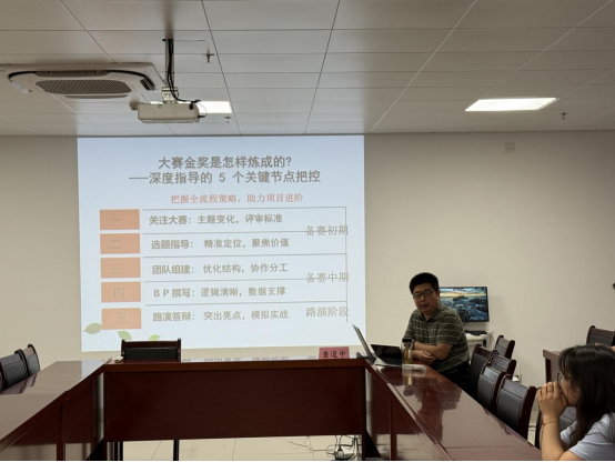 6 月 17 日下午,william威廉中文官网特邀理论经济学硕士生导师、国际商务专业硕士生导师、中国项目 SYB 培训师、省创新创业大赛评委专家査道中教授,带来主题为 “大赛金奖是怎么练成?—— 教师深度指导的 5 个关键点把控” 的专题分享,公司全体教师齐聚一堂,认真聆听学习。